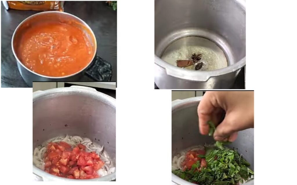 Add Aromatics: Add one chopped tomato, mint leaves, and curry leaves. Sauté until the tomatoes become soft.