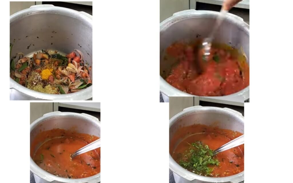 Spice Seasoning: Add red chilli powder, coriander powder, and turmeric. Fry for a minute until the raw smell of the spices disappears.
