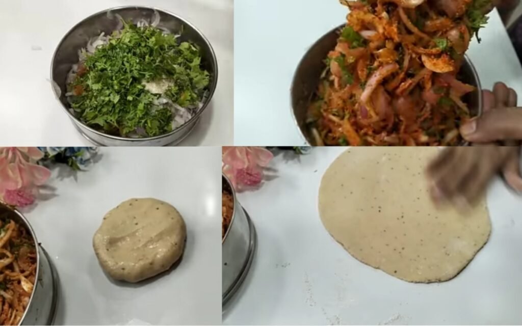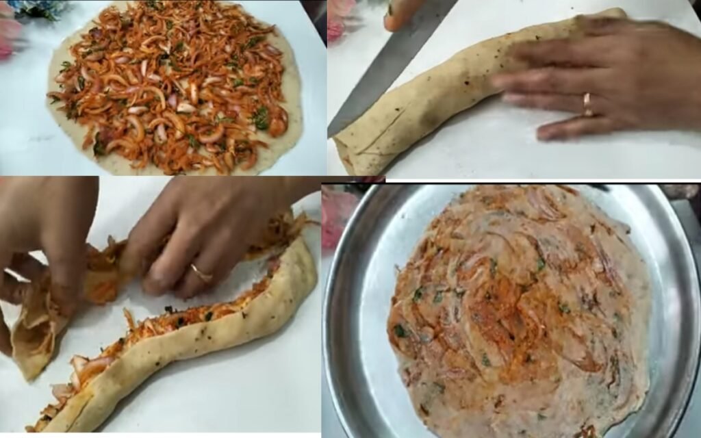 Dust with flour and gently roll it out again. Do not press too hard, or the onions might tear through. Keep it slightly thick.