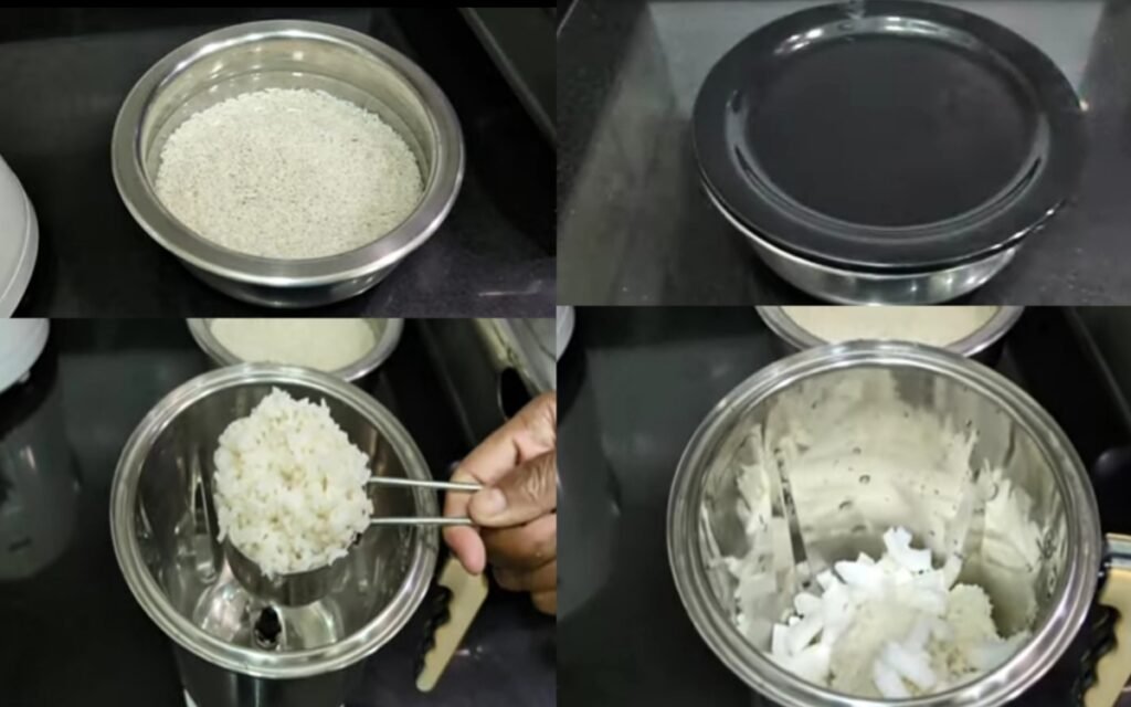 In a mixer jar, add ½ cup of cooked rice, ⅓ cup of fresh coconut (peeled), and a little coconut water if available.