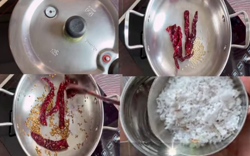 In a small pan, heat 1/2 tsp oil. Roast red chillies, urad dal, coriander seeds, and cumin seeds on low flame until the dal turns golden brown.