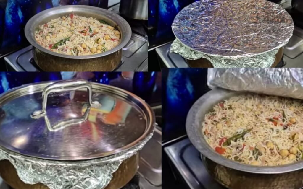Once the water is mostly absorbed, cover the pot with silver foil (or a tight lid) to create a “Dum” effect.