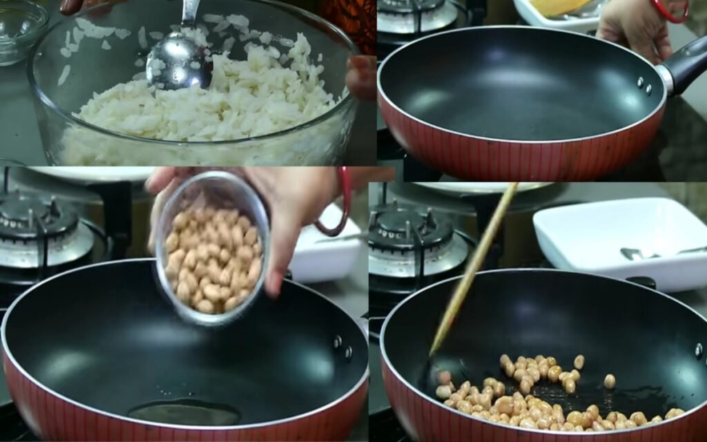 Roast 1/2 cup of peanuts until they become crunchy and change color. Set them aside in a bowl.