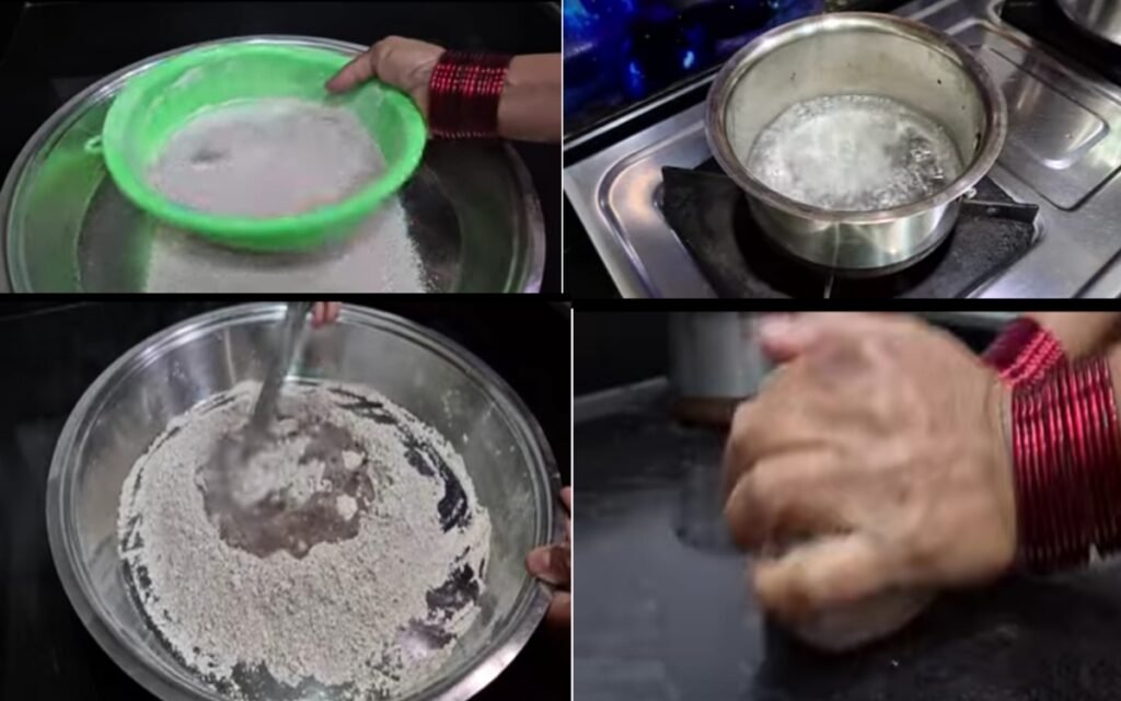 Hot Water Method: Instead of the ‘ukkiri’ method (boiling flour in water), this video uses a simpler approach: add a pinch of salt to boiling water and pour it directly onto the sifted flour.