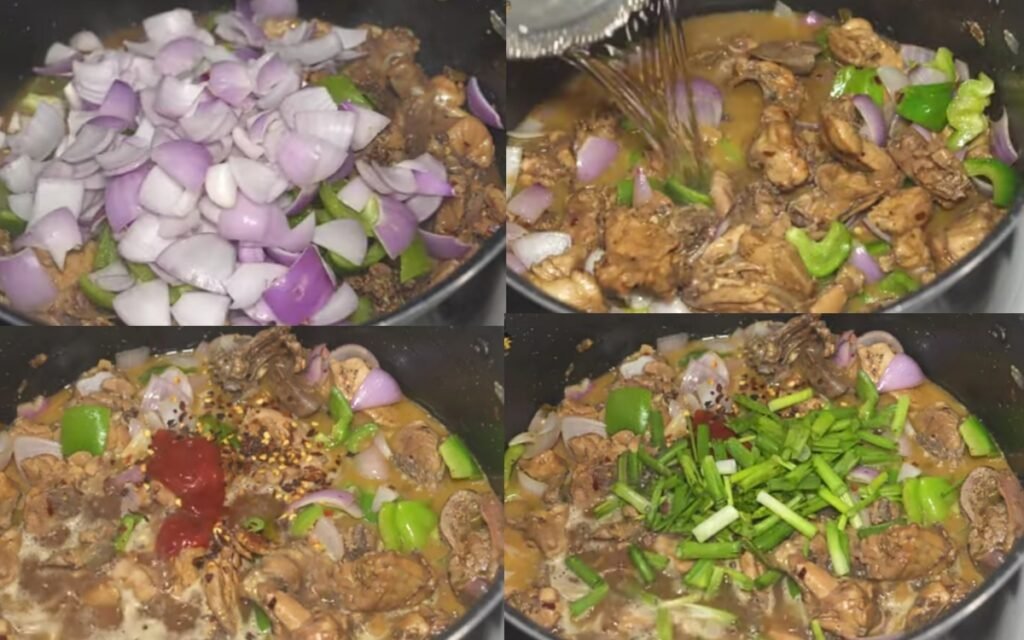 Toss in large diced onions and capsicum. Sauté them on high heat for a minute to keep them crunchy.