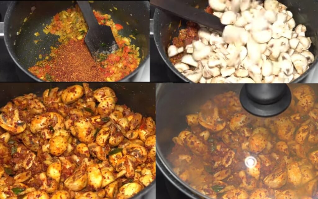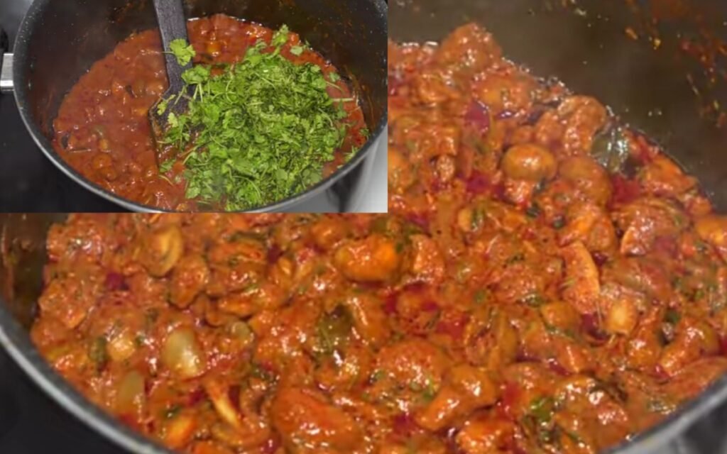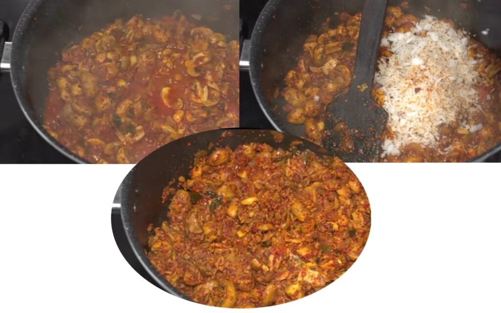 Finishing: Cook until the gravy thickens and coats the mushrooms. Add jaggery for balance and garnish with fresh coriander.