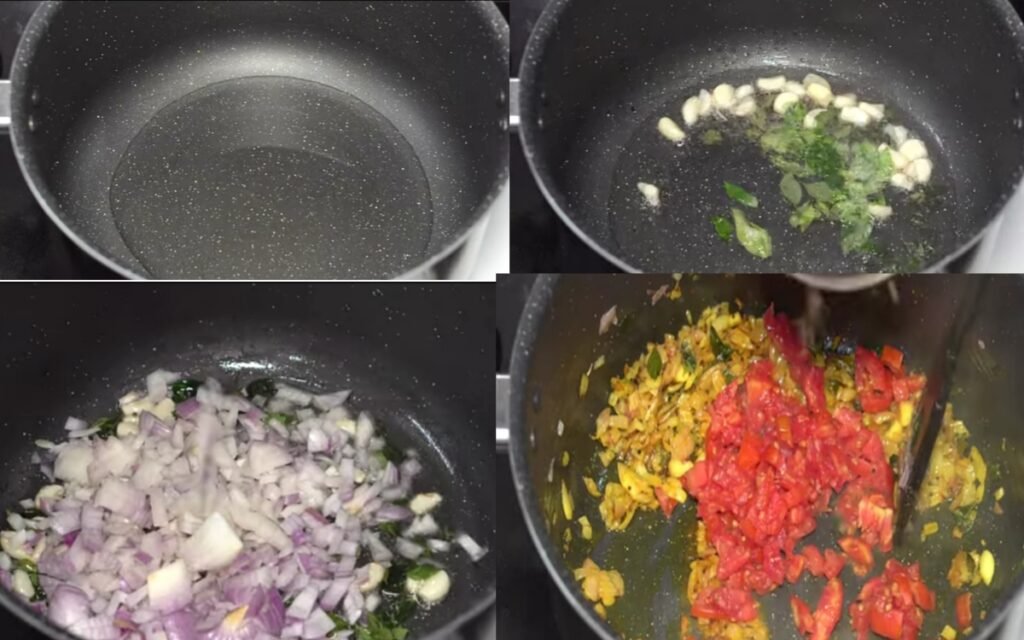 The Base: Heat oil, splutter mustard seeds, add crushed garlic, curry leaves, and onions. Sauté until onions are translucent.