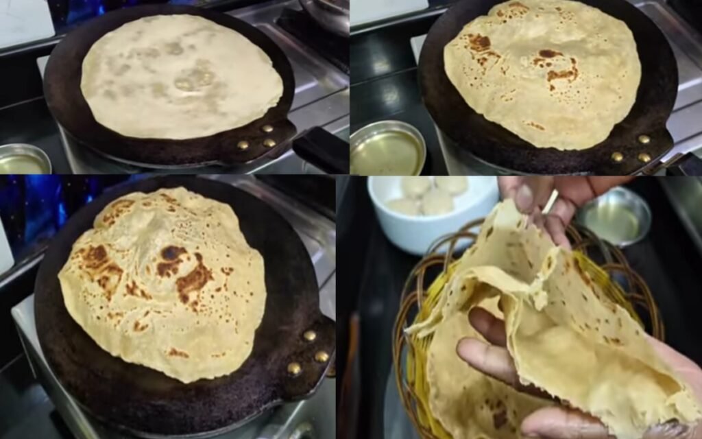 Roast both sides until golden brown spots appear. The chapati should puff up beautifully due to the layering technique.