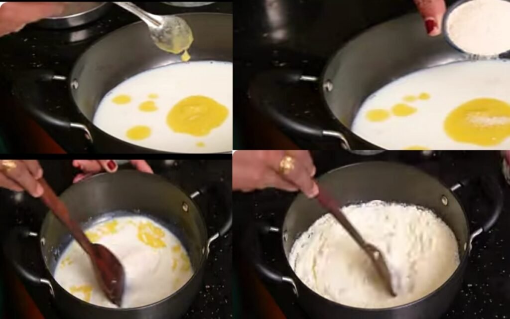In a bowl (off the stove), mix 1 cup of milk, 2 spoons of ghee, and 1 tablespoon of rava.