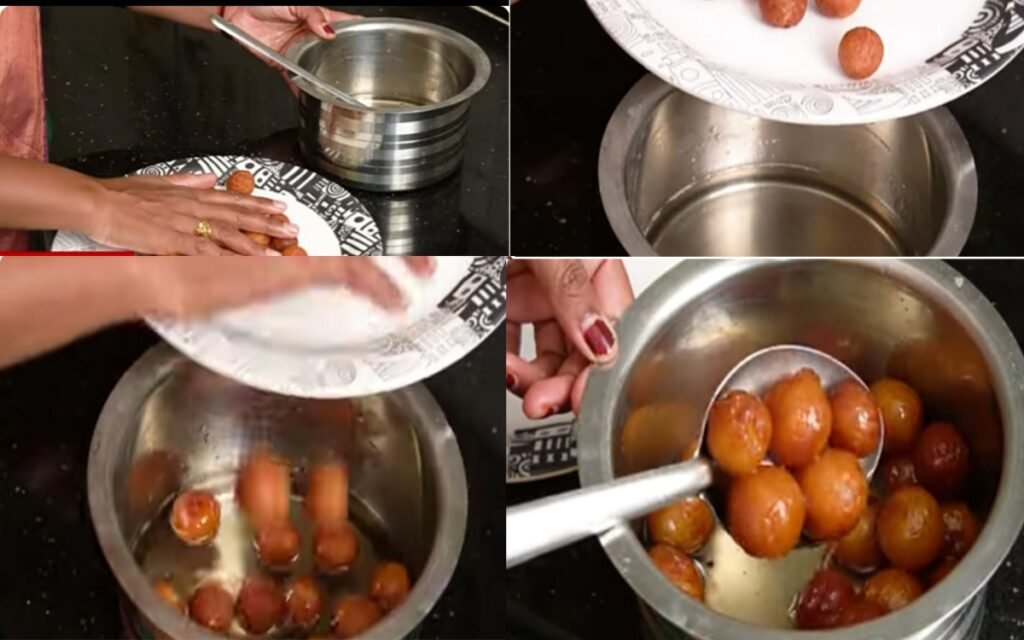 Unlike ready-mix jamuns, the host recommends letting both the fried jamuns and the sugar syrup cool slightly (lukewarm) before combining them.