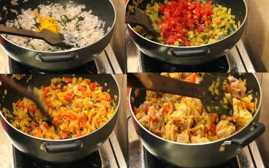 Add the cleaned chicken pieces to the sautéed onions and tomatoes.