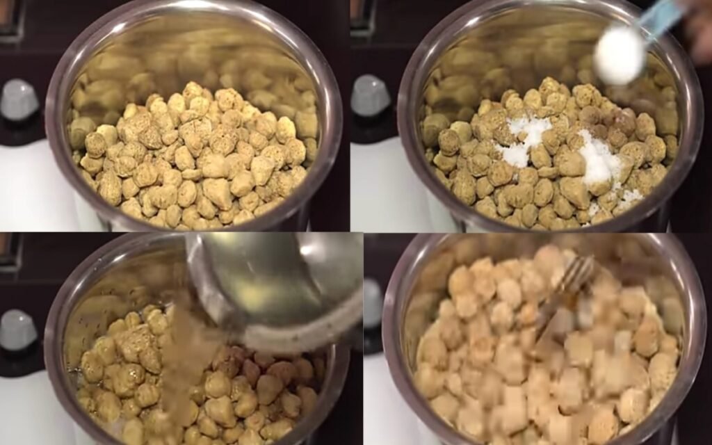Soak soya chunks in hot water with a pinch of salt for 15-20 minutes.