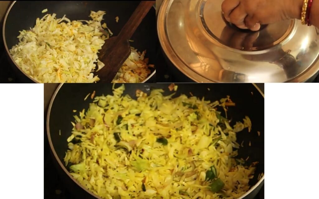 Simmer: Cover the pan with a lid. Note that there is no need to add water, as the moisture from the cabbage is sufficient for it to cook.