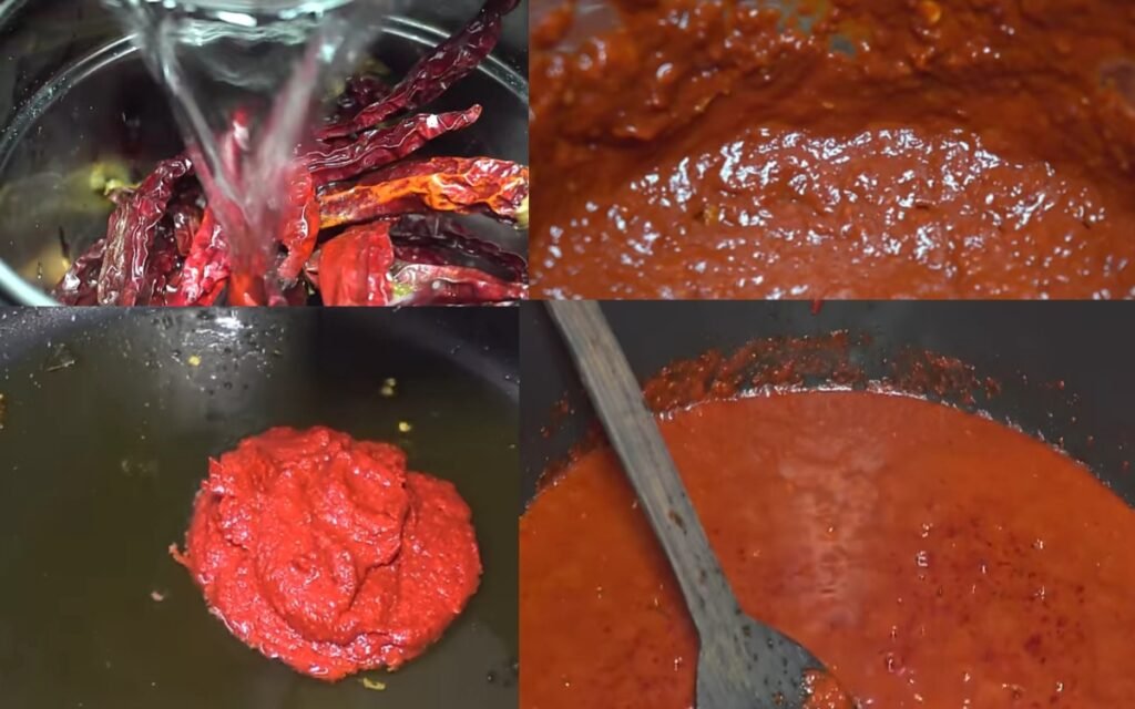 The process begins by dry-roasting the red chillies, coriander seeds, cumin, fennel, peppercorns, and methi seeds until they become fragrant. Be careful not to burn them.