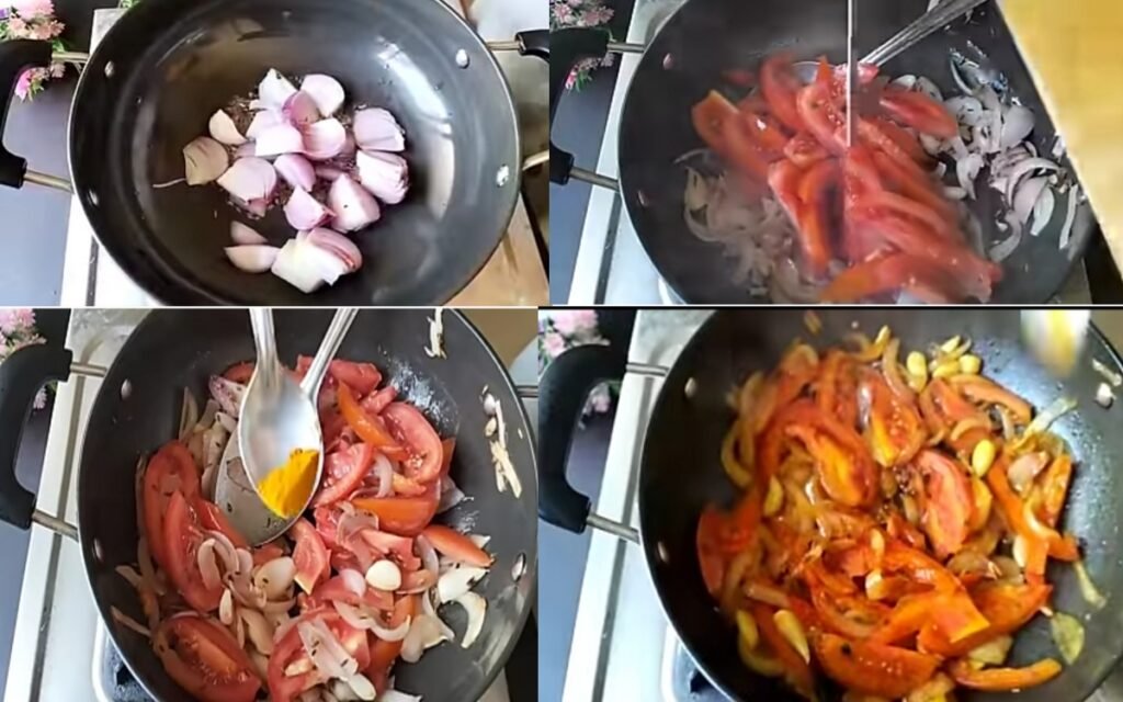 Add sliced tomatoes, a pinch of turmeric, and some salt. Sauté until the tomatoes turn soft.
