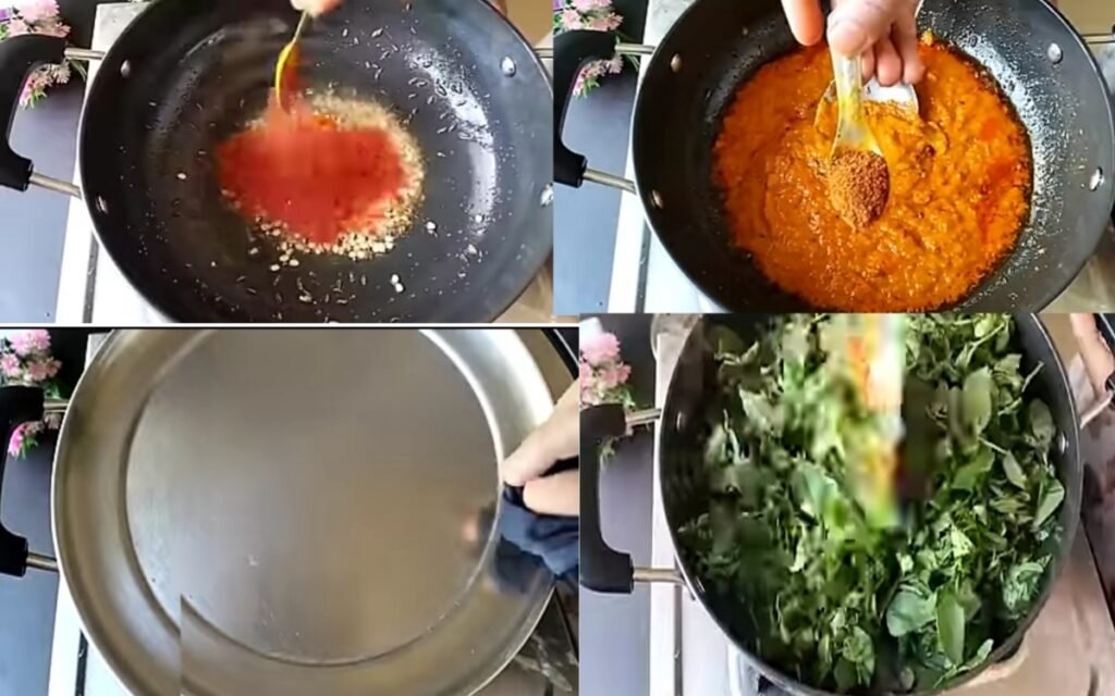 Mix well and cover with a lid for about 2–3 minutes until the leaves are soft.