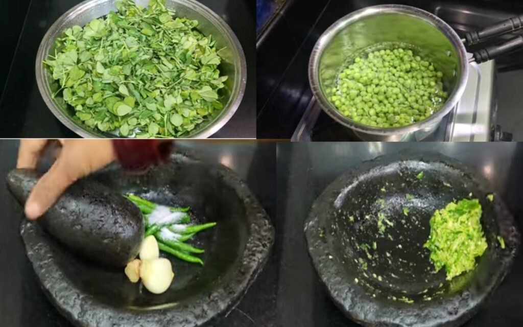 Using a mortar and pestle or a mixer, crush the green chilies, ginger, and garlic into a coarse paste. This fresh paste gives the dish its authentic flavor.