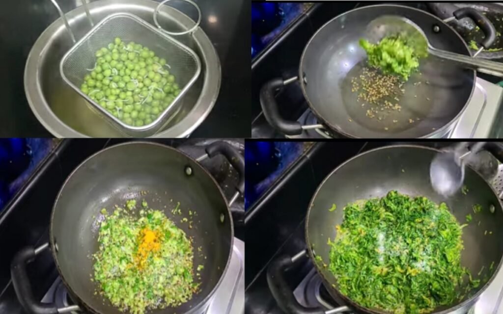 Boil the green peas in a separate pot with a pinch of salt until they are soft. Drain the water and set aside.