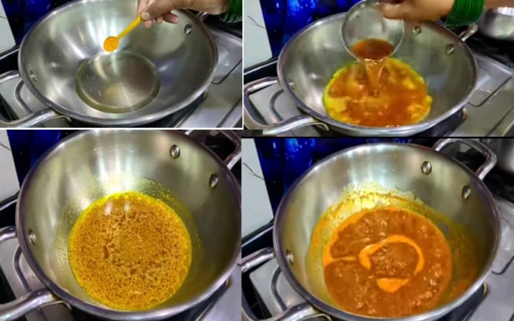 In a pan, heat a little oil and add turmeric powder.