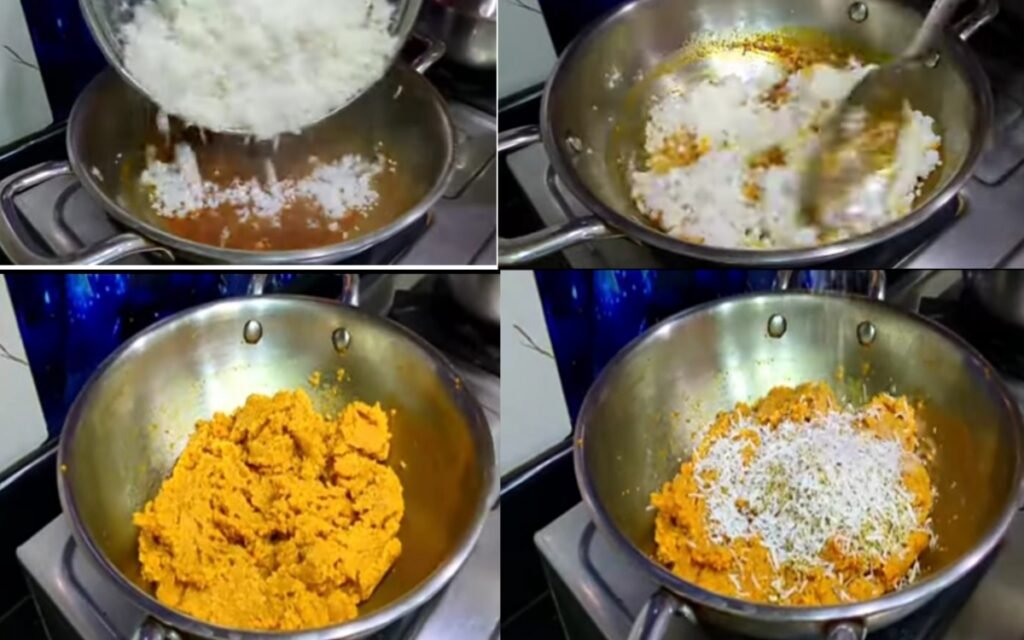 Dry roast white sesame seeds and grated dry coconut in a pan.