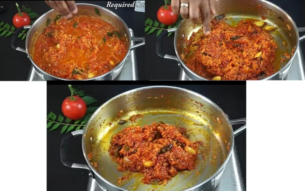 The Thokku is ready when the oil begins to separate from the sides of the mixture and starts floating on top. At this stage, you can add a small piece of jaggery to balance the tanginess of the tomatoes.