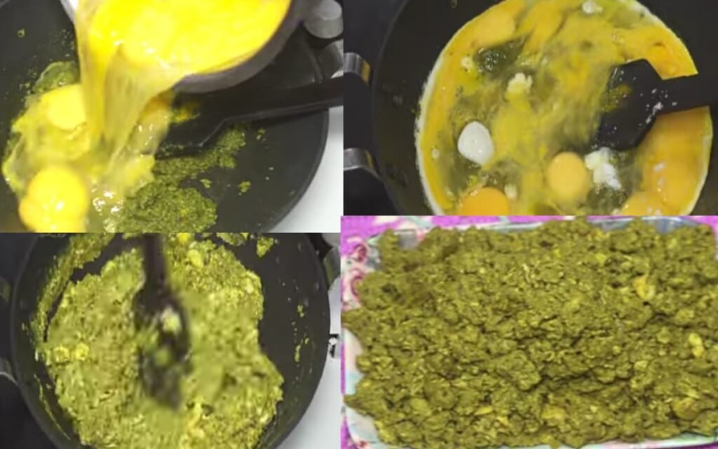 On medium heat, continuously stir and scramble the eggs so they incorporate with the green masala.