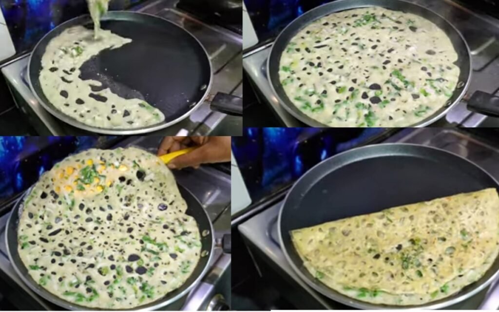 Pour the thin batter from the outer edges toward the center (similar to Rava Dosa style). Do not spread it with a spoon; let the liquid fill the gaps.