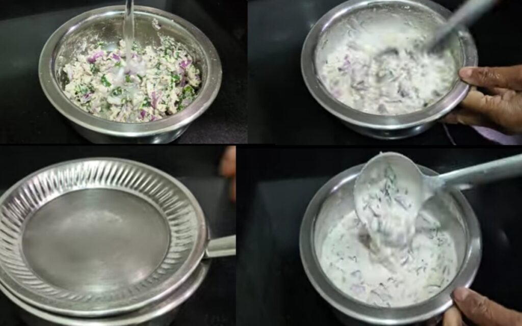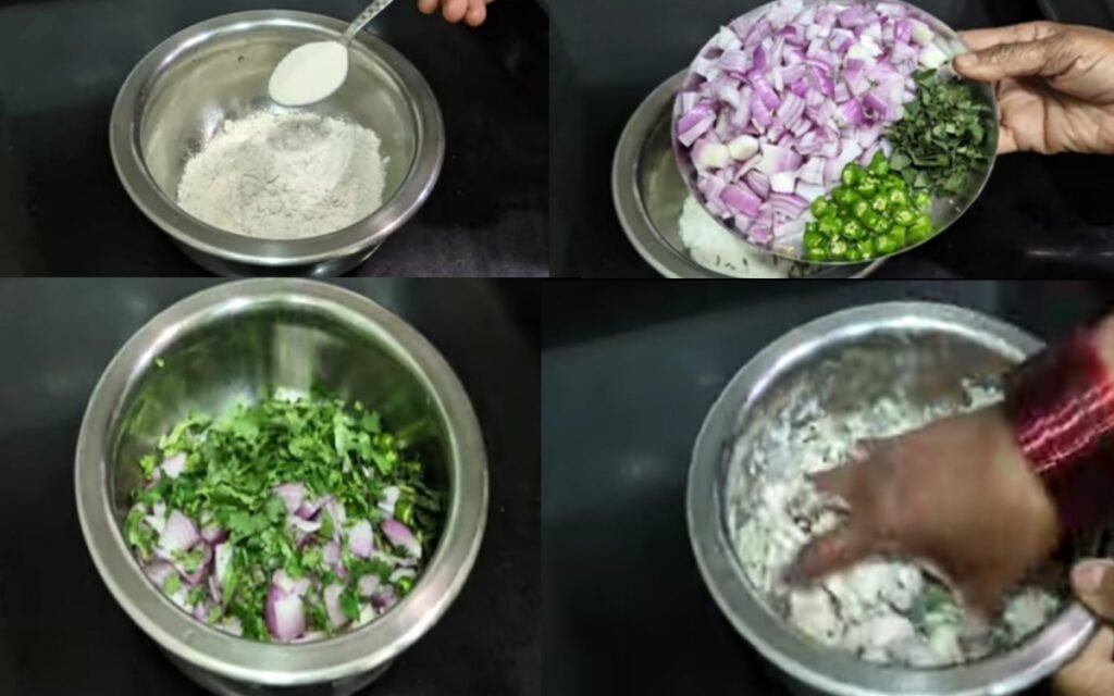 Prepare the Batter : In a mixing bowl, combine 1 cup of jowar flour with 2 tablespoons of fine rava. Add cumin seeds, a generous amount of chopped onions, green chilies, curry leaves, and coriander leaves. Add salt to taste.
