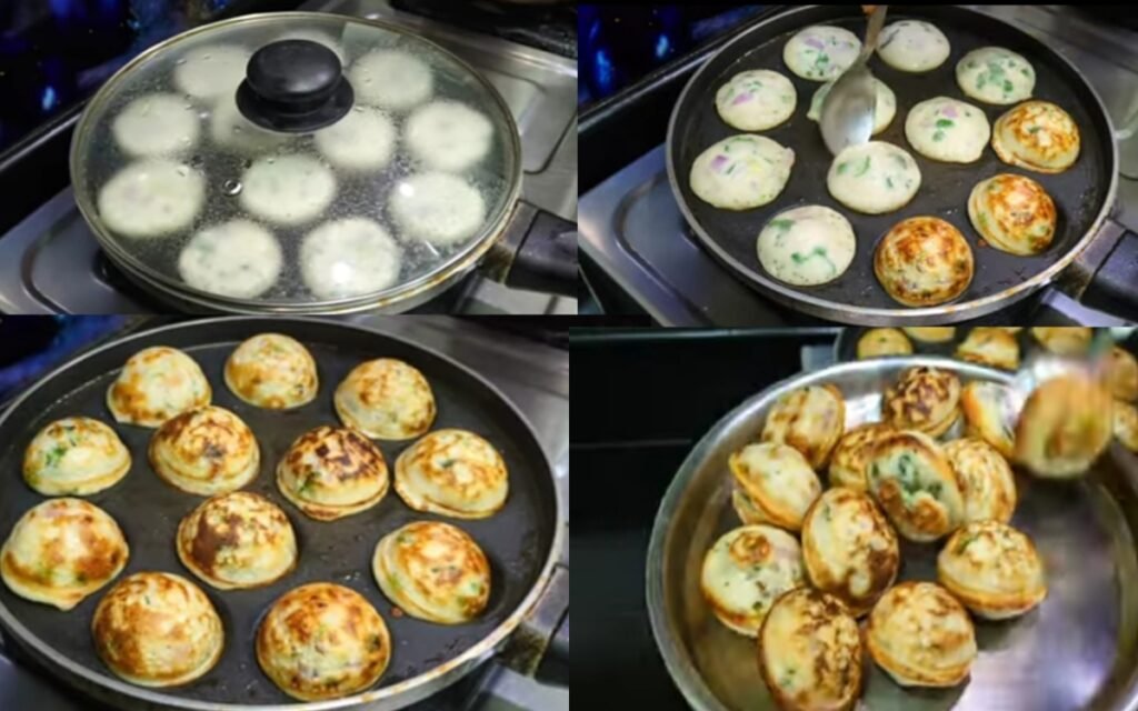 Flip and Crisp : Remove the lid, add a few drops of oil on top of each paddu, and flip them over to cook the other side until they turn golden brown.