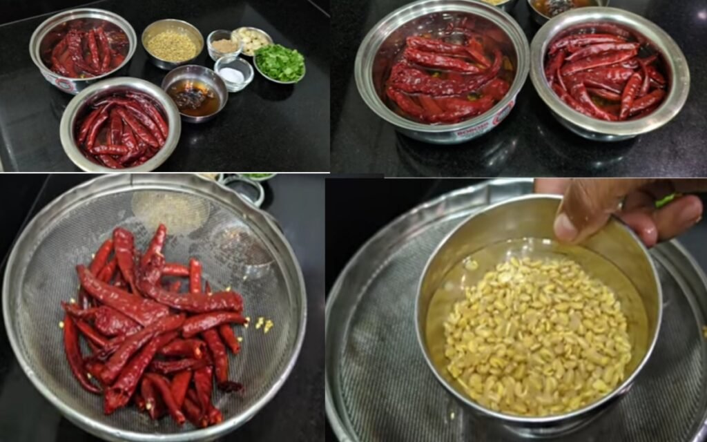 Dried Red Chillies: A mix of Byadagi (for color) and spicy chillies, soaked in hot water for 8–10 minutes.